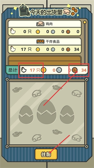 4、查看【今日出貨量】,【17只】對(duì)應(yīng)獲取【34】資源,點(diǎn)擊【前進(jìn)】可繼續(xù)推進(jìn)流程。