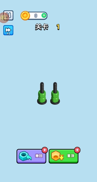 2、關卡1里只有兩顆混色螺絲柱,只要把其中一顆上的綠色螺絲挪到另一顆上,就能快速完成同色歸類,輕松通過這個入門關卡。