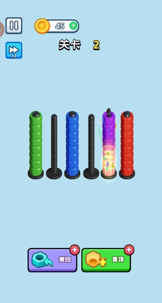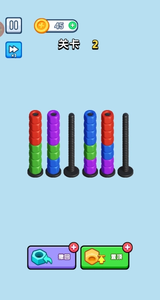 4、觀察關卡2里已分類好的純色螺絲柱,先把同色的零散螺絲移到對應的柱子上,利用空柱暫時存放混色的螺絲,防止打亂已經(jīng)整理好的順序。