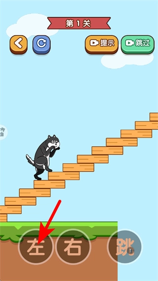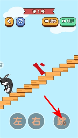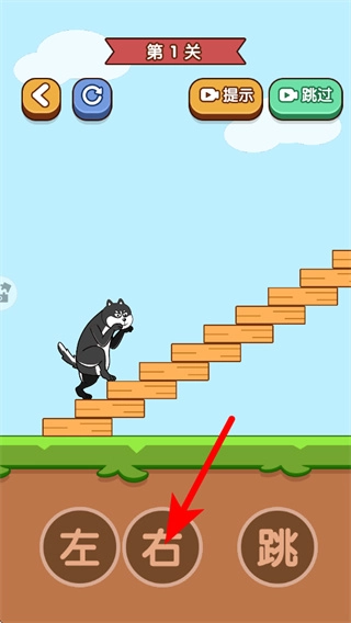 2、第1關中,依照紅色箭頭指引,點擊右按鈕控制角色向右移動,逐步靠近樓梯區域,為攀爬做準備。