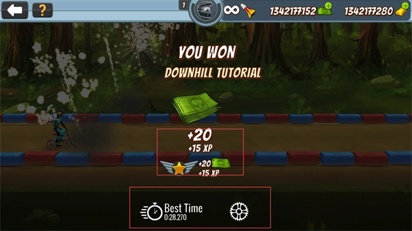 4、完成關卡后,獲取獎勵,查看最佳時間,用于后續自行車升級和解鎖新賽道,提升競速能力。