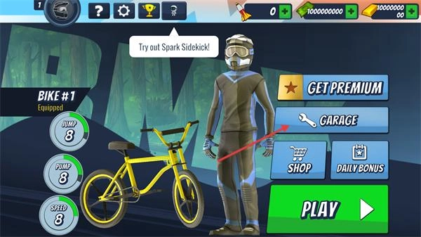 1、在初始界面點擊【GARAGE】按鈕進入車庫,可查看已裝備的【BIKE#1】及各類道具。