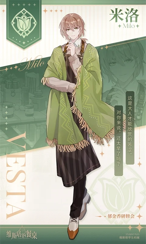 背景:今日黃昏你說(shuō)什么呢,可憐而孤獨(dú)的靈魂。午夜鐘聲響起,陰郁的囚徒從夢(mèng)中蘇醒,執(zhí)筆蘸取黑夜。用色彩描繪食材,用畫(huà)筆勾勒芳香,刻刀在暗夜中舞動(dòng),引來(lái)繆斯的身影。但黎明來(lái)臨之時(shí),他將再次隱入黑暗,拒絕靠近他人,也拒絕被靠近。你說(shuō)友誼。異色雙瞳微微瞇起。只有幼稚的人,才會(huì)執(zhí)著于這種虛幻的東西。