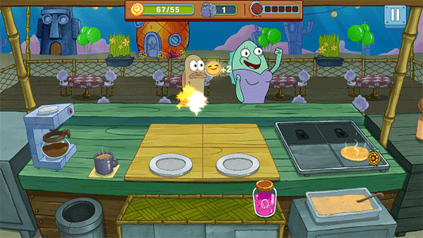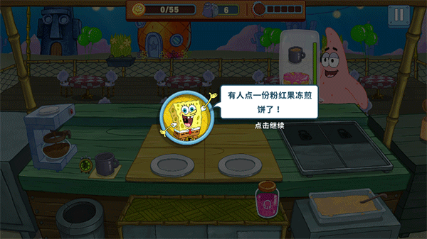 3、菜譜解鎖:隨著游戲的進行,玩家可以解鎖更多的菜譜,豐富菜單種類,滿足顧客的不同需求。采用了可愛的畫面風格,讓玩家感受到海綿寶寶的歡樂世界。