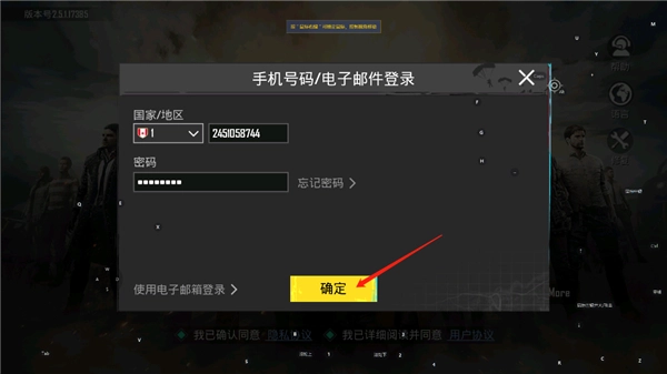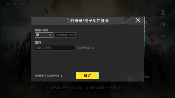 4、進入后,玩家需要選擇好自己的國家,然后在輸入手機號和登錄密碼,點擊確定;