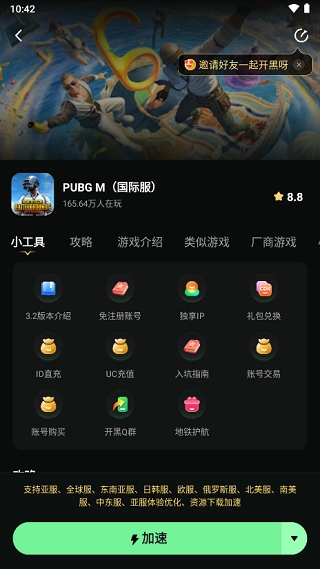 2、在《PUBG MOBILE》全球服處,點擊“加速“就能順利加速PUBG MOBILE國際服啦,