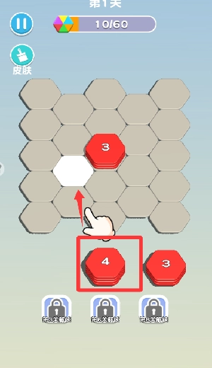 3.長按紅色的六角形色塊并拖動,把它移到合適的地方,這樣就能完成第一次消除了。