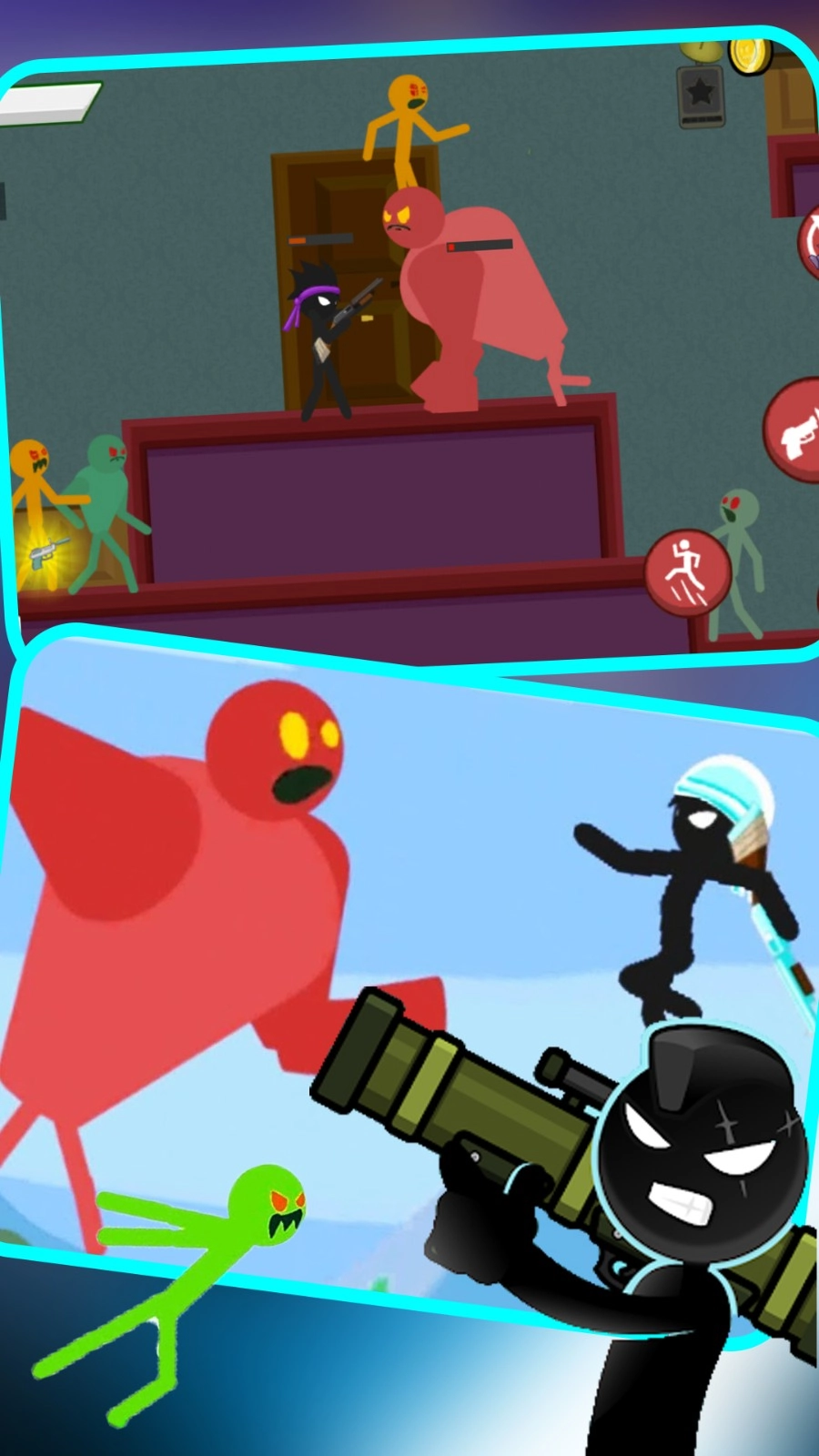 1.玩家通過虛擬搖桿控制火柴人英雄在關卡限定區域內移動,并利用瞄準按鍵對不同距離的僵尸進行射擊。