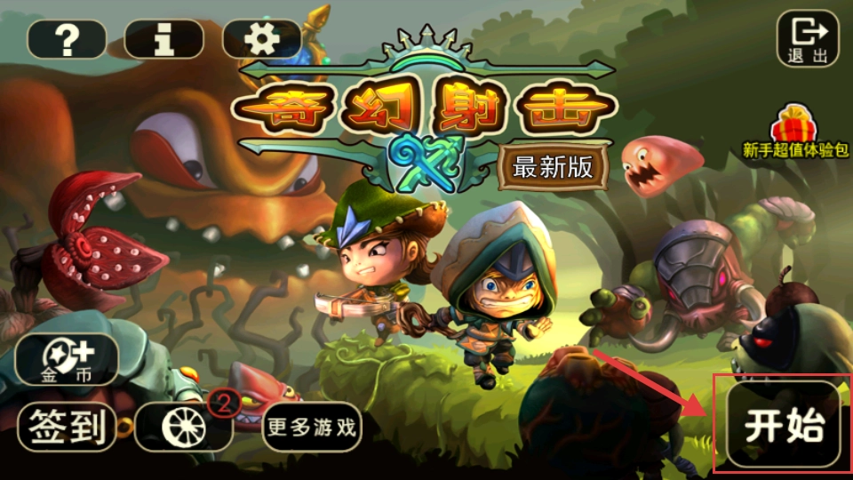 1、打開【奇幻射擊-最新版】的主界面后,點(diǎn)擊右側(cè)紅框標(biāo)注的【開始】按鈕,即可啟動(dòng)游戲。