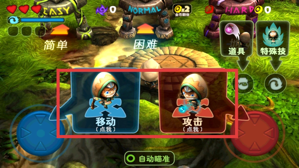 2、在操作設(shè)置界面,點(diǎn)擊【移動(dòng)-點(diǎn)我】和【攻擊-點(diǎn)我】熟悉操作,可開啟【自動(dòng)瞄準(zhǔn)】輔助戰(zhàn)斗。