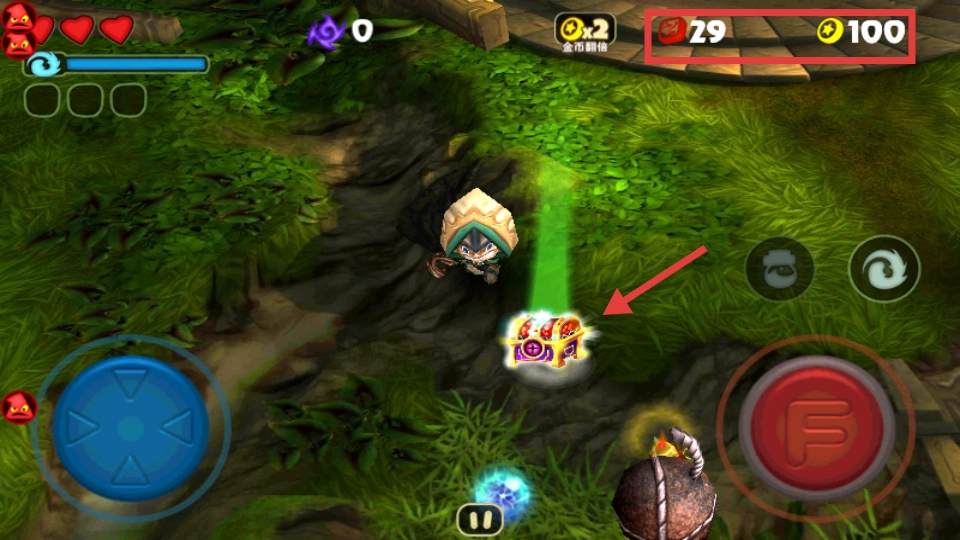 4、擊敗敵人后出現(xiàn)的【寶箱】要靠近領(lǐng)取,可獲得【29】積分和【100】金幣等獎(jiǎng)勵(lì)。