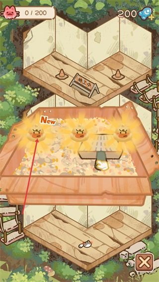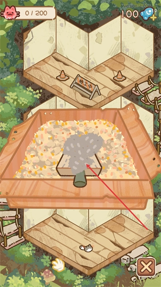 1、進入游戲后觀察分層場景,先熟悉當(dāng)前場景布局,點擊左下角的貓砂鏟可按指引操作工具推進游戲進程。