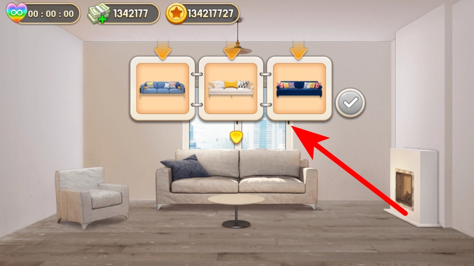 2、在沙發選擇界面挑選心儀的款式如藍色帶裝飾款,確認后完成沙發的更換,美化房間布局。
