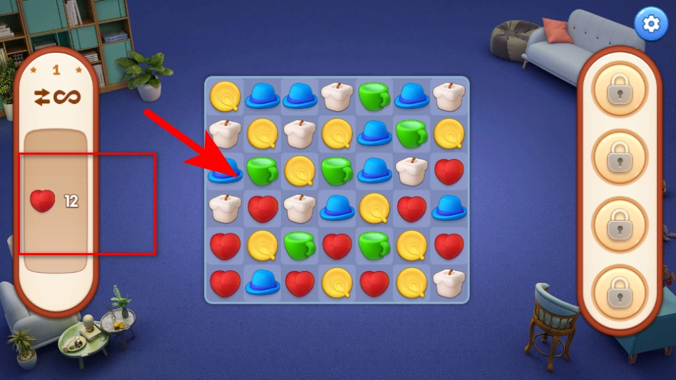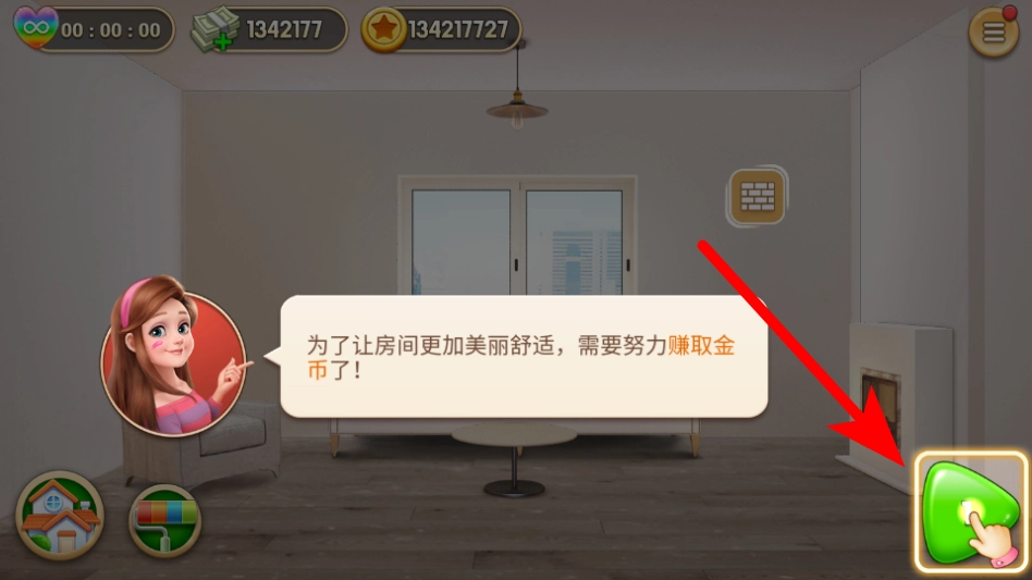 3、點擊界面的綠色按鈕,進入消除關卡,通過完成消除任務來賺取金幣,用于后續家居裝扮。