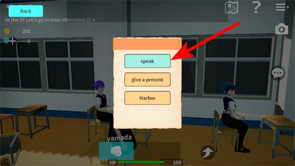 3、在教室內靠近其他角色后,選擇speak選項,就能與對方觸發對話互動,推進劇情內容。