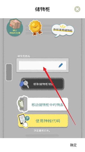 2接下來會(huì)進(jìn)入儲(chǔ)物柜的解謎環(huán)節(jié),點(diǎn)擊研究員姓名的輸入框,輸入自己的名字。