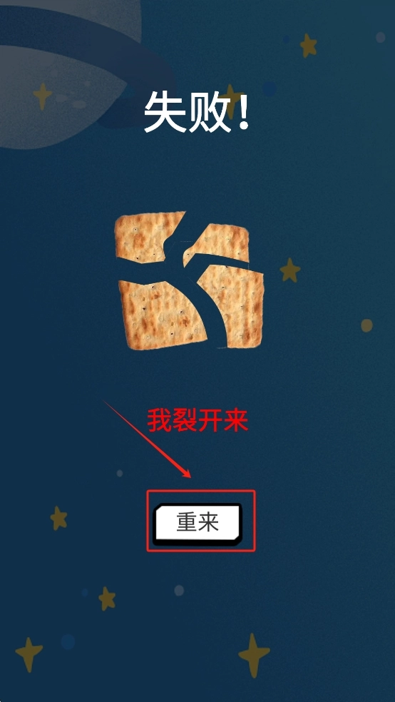4、要是餅干出現破裂的情況,游戲即宣告失敗,此時可點擊“重來”按鈕以重新開啟游戲。