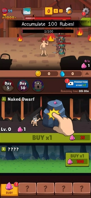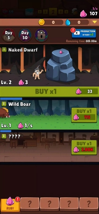 2、通過點擊互動或放置操作自動獲取紅寶石,解鎖矮人礦工的生產線,以此建立起穩定的經濟根基。在資源不斷積累的過程中,逐步招募更多英雄加入,進而擴大隊伍的整體規模。
