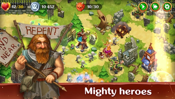 2、塔防策略玩法深度十足,涵蓋射擊、燃燒、毒、爆炸等多種類型防御塔,玩家可自由搭配英雄與魔法進行布局;