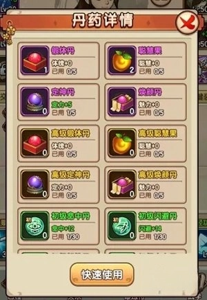 6、靈丹:選擇丹藥給弟子使用,不同的丹藥增加屬性不同,使用限制不同。