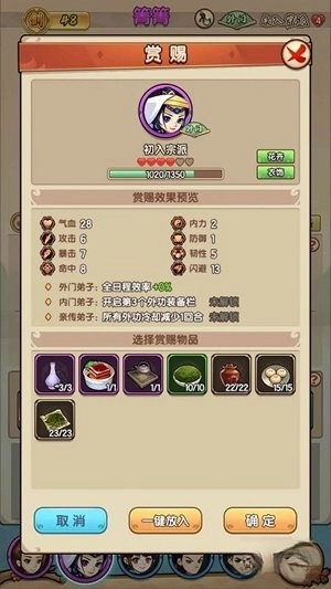 3、初入宗門:點擊可查看弟子在宗門的地位以及賞賜效果預覽。(同賞賜按鈕進入界面一致)