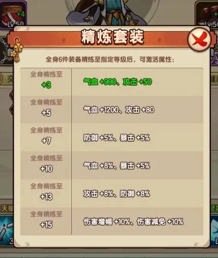 全身6件裝備精煉到指定等級后,可激活相應屬性。