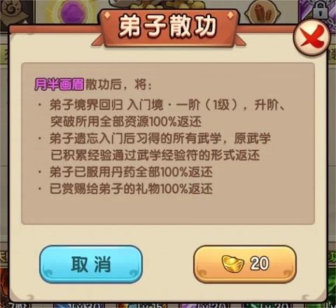 3、散功:弟子境界回歸入門境·一階(1級),全部資源包含升級武學的武學經驗、突破、武學、禮物、丹藥等100%返還。(掌門再也不用擔心選錯弟子啦~)