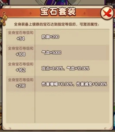 4、寶石套裝:全身裝備上鑲嵌的寶石達到指定等級后,可激活屬性。