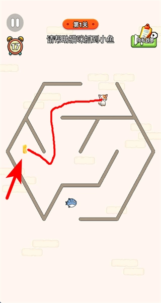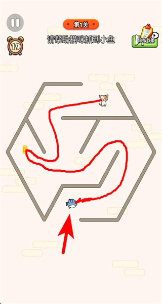 需要逐步理清迷宮的構造,規劃出合理的畫線方案,防止因規劃錯誤而造成路線受阻或掉入陷阱,只有設計出順暢的路徑,才能幫助小貓成功找到小魚,通過關卡考驗。