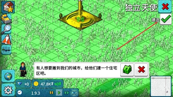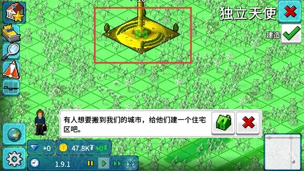 4、點(diǎn)擊界面右上角的確認(rèn)按鈕,完成【獨(dú)立天使】的建造;與此同時(shí),還能處理下方居民住宅的建造提示,以此完善城市。