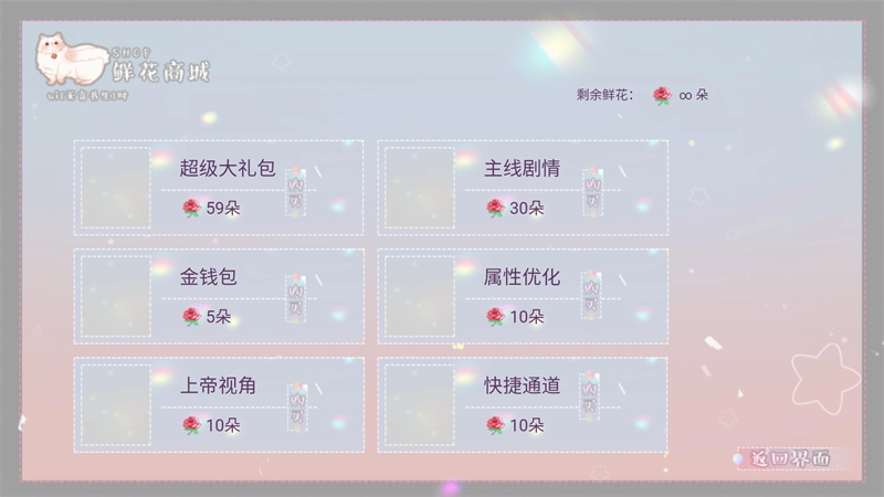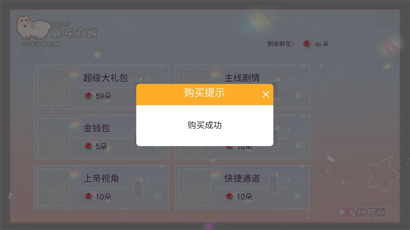 3、鑒于本游戲已實現無限鮮花功能,我們能夠直接進入鮮花商城,購買超級大禮包、金錢包、主線劇情等各類物品。
