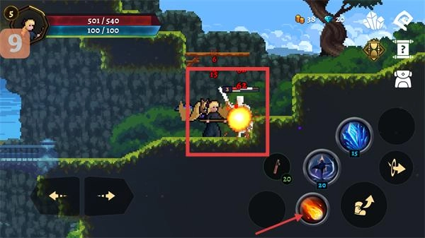 1、操控角色與【持斧敵人】展開戰(zhàn)斗,點擊【火焰】技能按鈕發(fā)動攻擊,注意自身【501/540】的血量情況,持續(xù)進行輸出直至擊敗敵人。