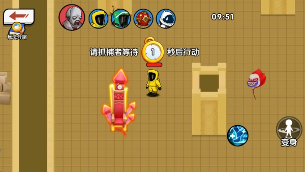 5. 小編選擇了躲藏者身份,倒計時結束后你得找好位置偽裝自己,點擊右側的變身按鈕就能完成偽裝。只要堅持10分鐘不被發現就能贏得勝利。