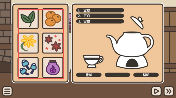 2、進入制茶界面后,從左側(cè)依次選擇【葉子】【餅干】【花朵】【香料】【蘑菇】【藥瓶】這些原料,將其填入右側(cè)的空白欄中,為沏茶做準備。