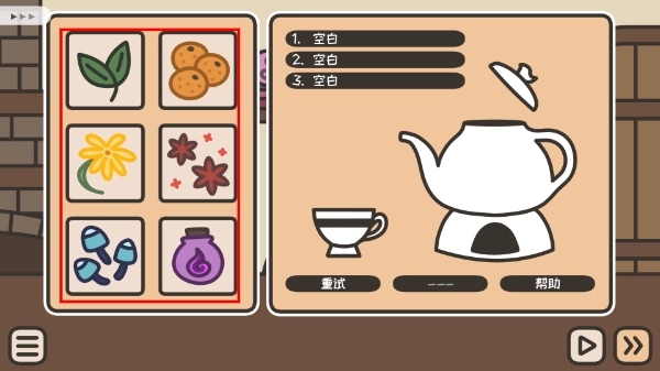 3、根據(jù)需求,在左側(cè)區(qū)域選擇三種材料進行泡茶。