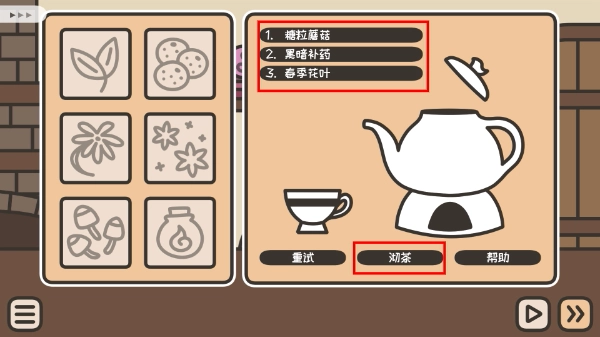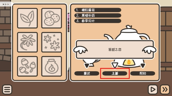 3、把【糖粒蘑菇】、【黑暗補藥】、【春芽托葉】依次填入對應(yīng)的欄位,接著點擊沏茶按鈕,耐心等待茶飲制作完畢。