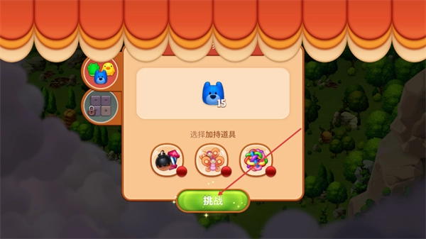 1、進入該界面后,先查看當前擁有的15個道具點數,在選擇加持道具區域挑選想要的道具,選好后點擊下方的挑戰按鈕即可進入游戲。