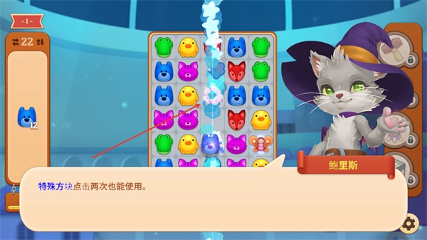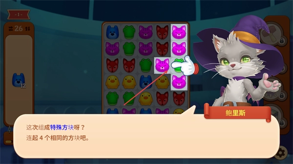 2、在該消除關卡中,按照鮑里斯的提示,嘗試連接4個相同的方塊,這樣就能成功組成特殊方塊,完成這一步的關卡要求。