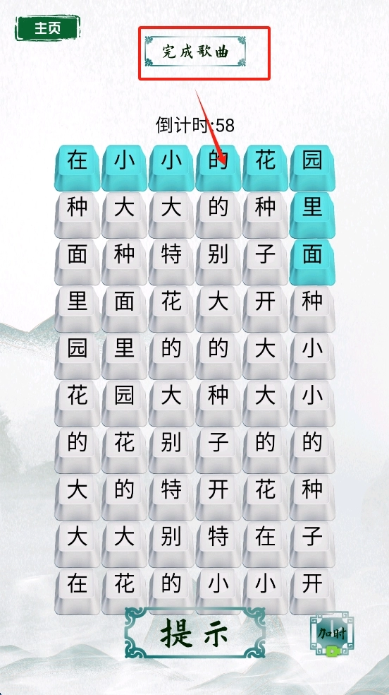 3、在游戲界面中,按照提示選擇正確的字塊,組成完整的句子或短語,點擊“完成歌曲”按鈕以提交答案。