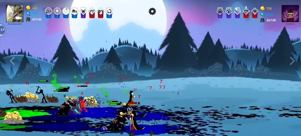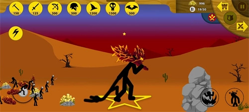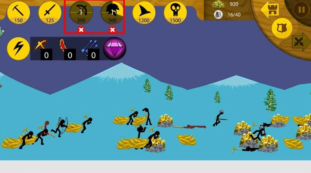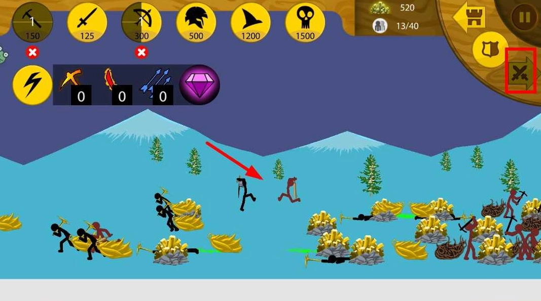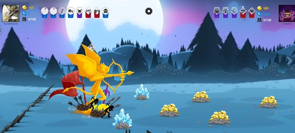 4、依據戰斗的實際需求,點擊界面上方的各類兵種圖標,就能召喚出對應的火柴人士兵,像弓箭手、持盾戰士這類角色都包含在內,以此來增強我方的戰斗實力,幫助隊伍贏得勝利。
