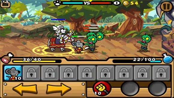 5、正式開始后,界面下方會顯示可召喚的兵種;箭頭用于操控角色移動;右下方的按鈕對應角色技能,使用時需消耗魔力,魔力的剩余量通過藍色瓶子圖標來顯示。