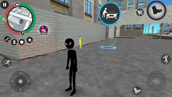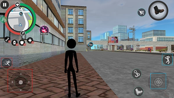 5、左側的搖桿點擊后能操控火柴人移動,右側的鉤子點擊后可化身蜘蛛俠自由穿梭,“人”的圖標點擊后能實現跳躍,瞄準鏡圖標點擊后可發起攻擊。