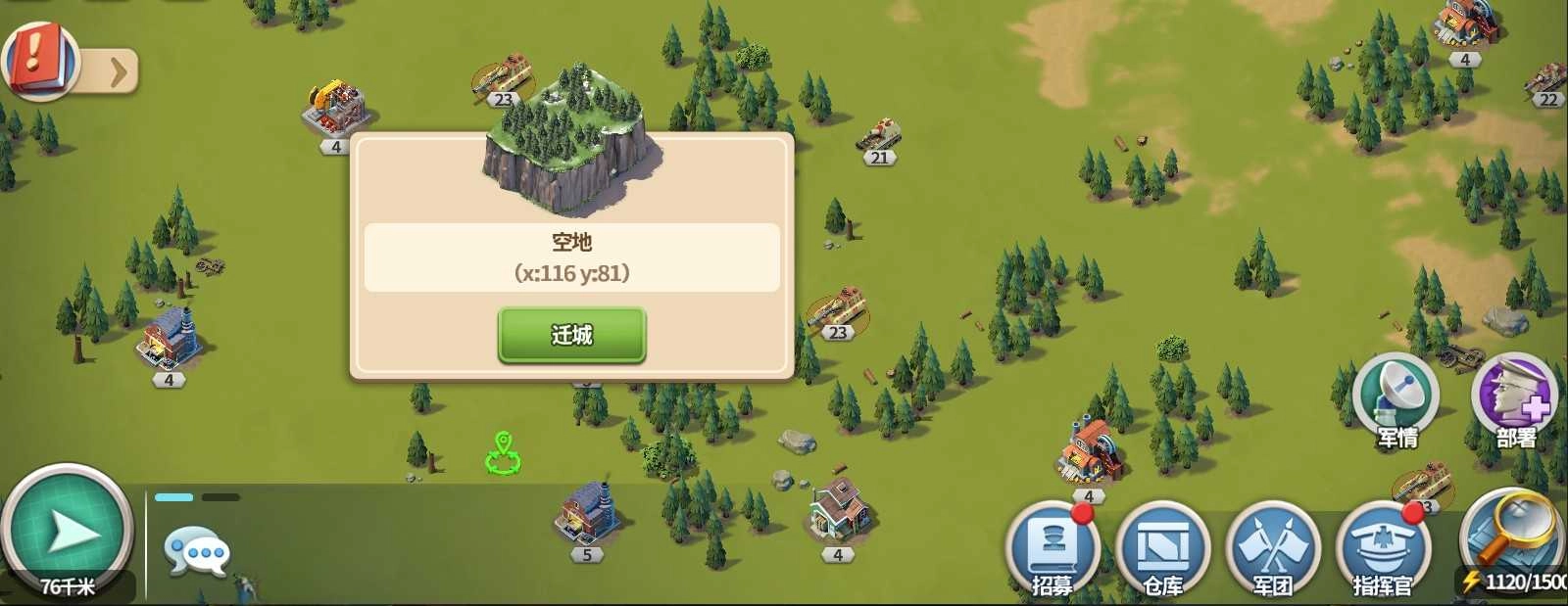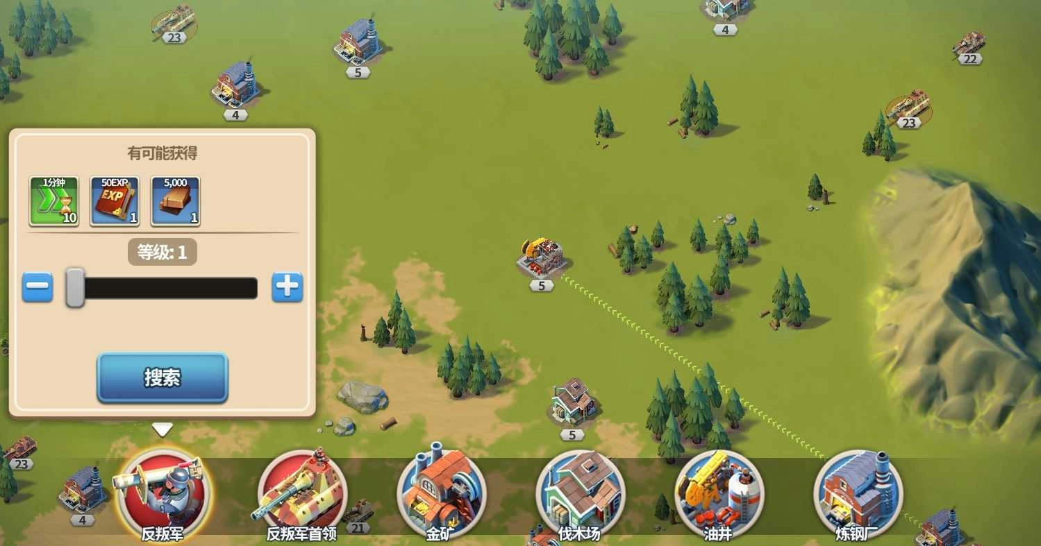 點擊界面左下角“放大鏡”形狀的「搜索」按鈕,可定位金幣、木材、石油、鋼鐵等資源進行采集,亦可鎖定反叛軍及首領發起挑戰。