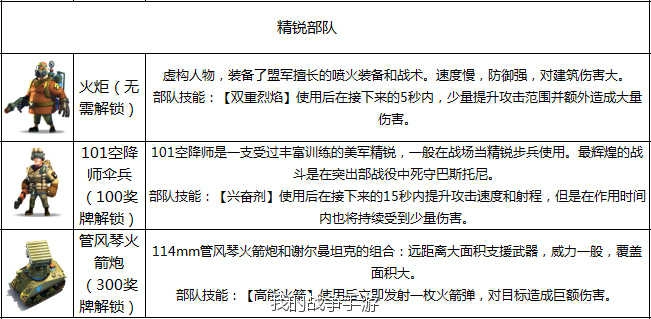 火炬(無需解鎖):裝備噴火裝置的盟軍特戰單位,移動緩慢但防御出色,專精建筑破壞。