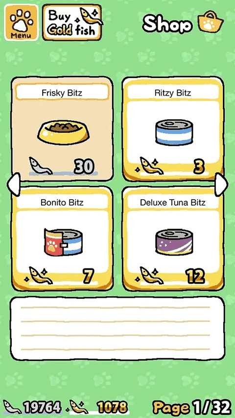 商店是資源流轉(zhuǎn)中樞,銀魚干與金魚干在此兌換貓糧、玩具及裝飾。普通貓糧如黃色食盆性價比高,適合初期快速積累基礎(chǔ)收益;三文魚貓糧則需金魚干購買,專為穿著服飾的特殊貓?jiān)O(shè)計(jì),能觸發(fā)更豐富的互動反饋。