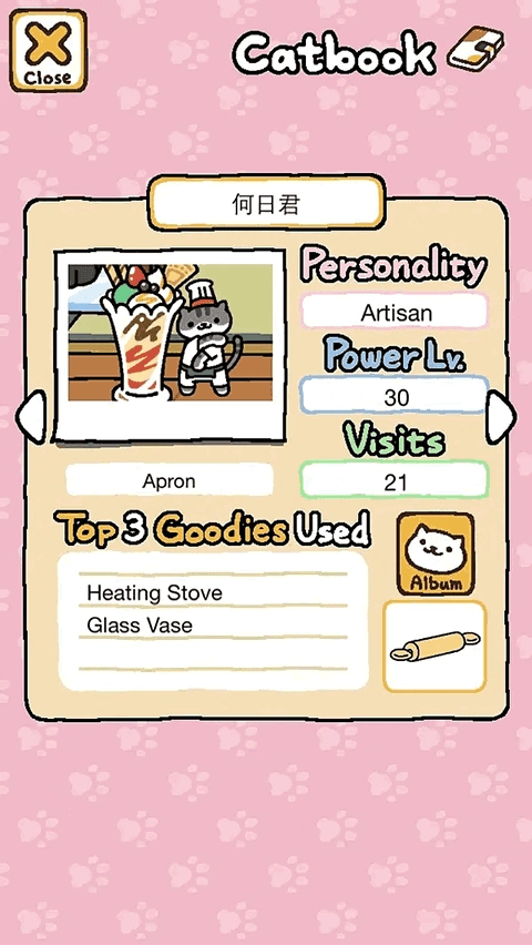 每只貓都擁有獨(dú)立相冊,拍攝瞬間自動歸檔,頭像隨時可換。照片下方標(biāo)注毛色特征,再往下則是它最中意的三樣道具排名,以及已贈予你的禮物清單。