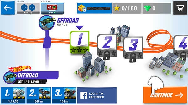 第一關(guān)從平緩坡道開始,讓玩家熟悉基礎(chǔ)操作。界面右下角的【CONTINUE】按鈕是推進(jìn)游戲流程的關(guān)鍵,輕點(diǎn)該按鈕即可進(jìn)入賽道準(zhǔn)備階段。