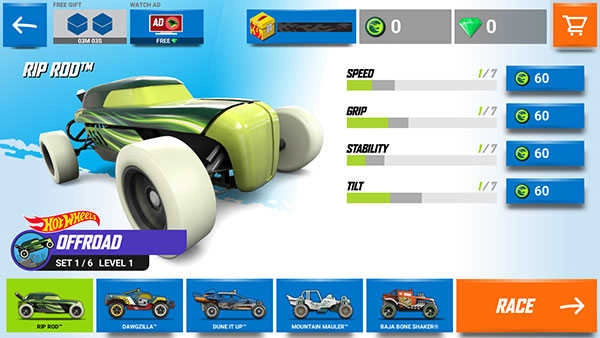 選車界面設(shè)計(jì)得簡潔又直觀,點(diǎn)擊界面中央的賽車縮略圖就能切換不同車型,右側(cè)的升級欄會清晰展示當(dāng)前的強(qiáng)化進(jìn)度。性能調(diào)校對車輛過彎時(shí)的穩(wěn)定性和騰空高度有著直接影響,所以建議新手先把抓地力作為優(yōu)先提升的方向。