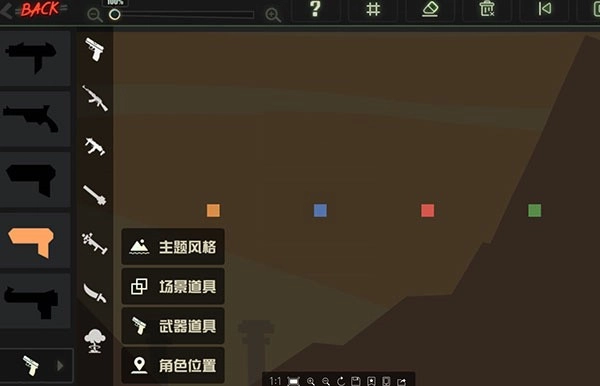 3、點擊之后。我們就可以創建地圖了,點擊左下方左后一個圖標,我們就可以切換主題、場景、武器、和角色的選項,我們長按自己地圖上面的物品可以拖動物品的擺放位置。