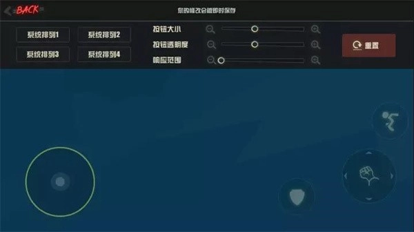 12、自定義布局中可以設置四個基本功能鍵的按鈕大小,按鈕透明度以及響應范圍,系統提供4種排列方案,我們可以保存4種常用的不同排列方案,以便之后快速切換。